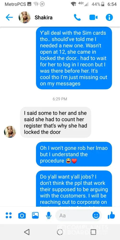 I visited the store on 7/18/2019 to temporarily switch my phone over to an old device because one had broken. Fereon was the representative that day so when I figured I wasn't receiving messages from certain ppl, I went back today 7/21/2019. Store was supposed to open at 12, no one was in. She pulled up late and locked the door, but I found out she had to...