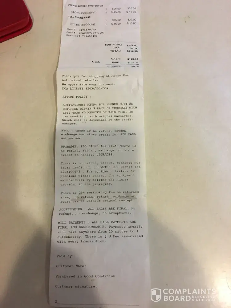 Purchased a 2 screen protectors for for lg arista phone. The rep stephanie provided a screen protector that didn't fit the phone but then didn't want to refund the 2nd screen protector when we seen that the first protector didn't fit. Now mind you both protectors were purchased. The store rep states that we cannot return accessories once purchased. Now i asked how was that to be known if she didn't state that prior to the transaction. She told me that the policy is on the receipt. Well, now how does that make sense when i still have to purchased the item in order to get a receipt? therefore i can still not return the item because i already purchased it. No one had left the store, the item had no been tampered with. $15 on an item that is of no use to me down the drain. When i asked for a manager no manager is in the store to help in situations like this.
