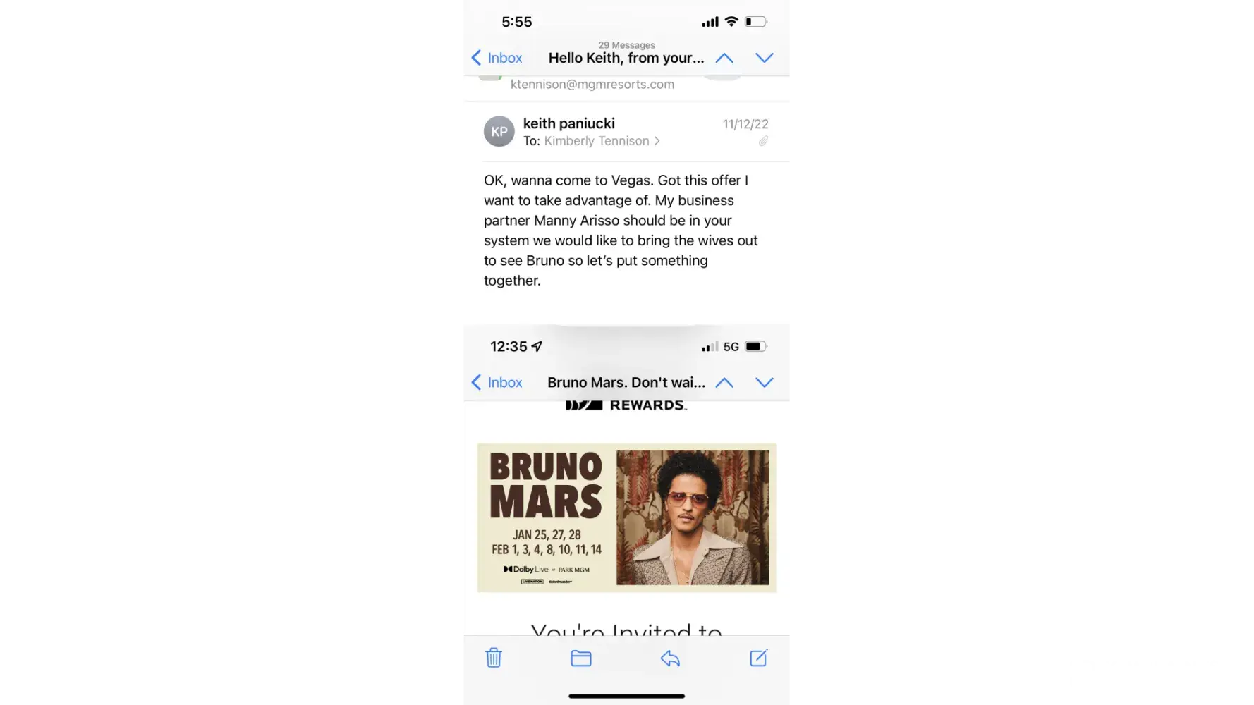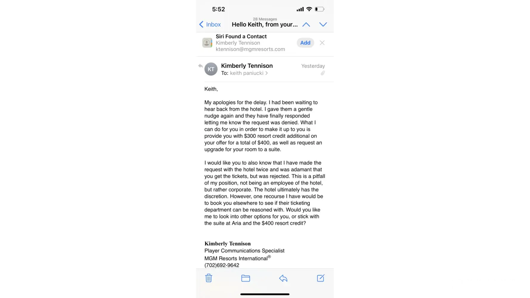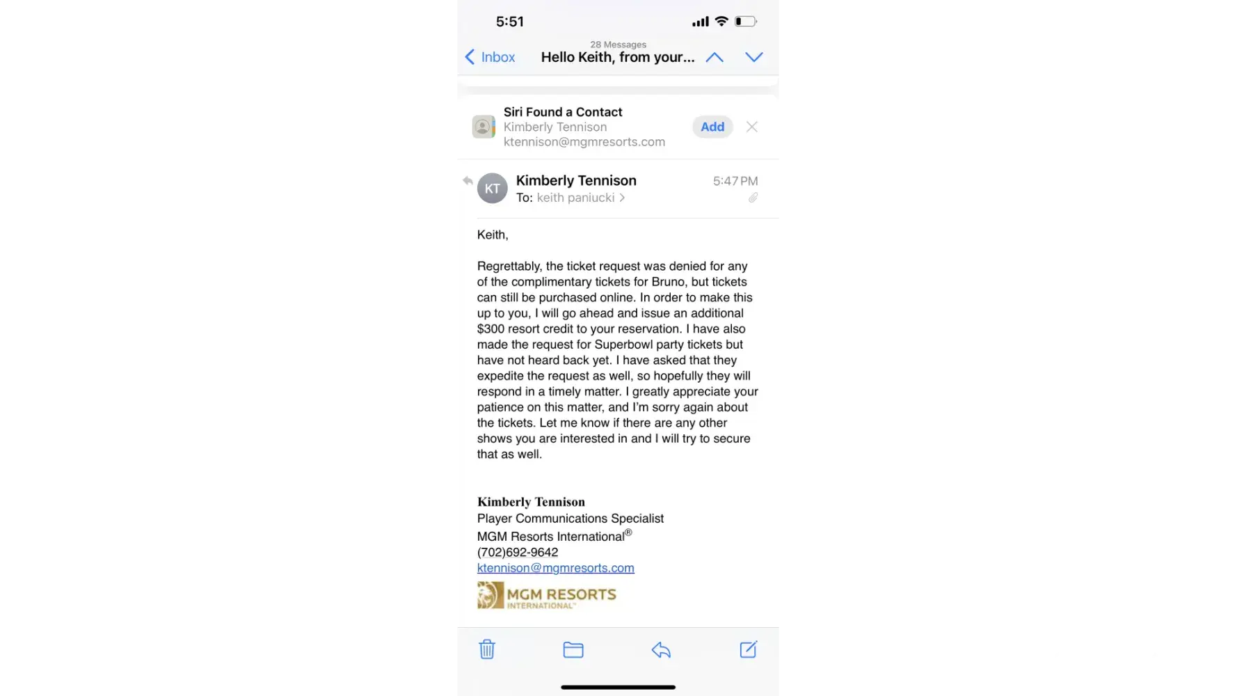 Sent offer for Bruno Mars tickets on Nov 9th sent email to Kimberly Tennison of the 12th that I would like to take MGM up on the offer and book me a trip. On Nov 22 she sent me a email with my confirmation #. I asked her to check and see if she could get me 4 tickets and if she couldn't I'll buy the other 2 I just wanted 4 together because another couple was coming with us all traveling from Florida. She mentioned having to check with the hotel and would let me know. This past Friday I was informed not only was she able to get the extra 2 tickets, she couldn't even get me my tickets so I have NO tickets. I've booked my airlines and our stay at Aria and now we are looking at cancelling the trip and are more disappointed than you could ever imagine. I was a platinum rewards client before covid and recently started to book trips back to the Beau Rivage since its your closest property to Florida. My member # is [protected]. I'm just having a difficult time understanding what happened here as I know nothing was dropped on my end. I contacted 3 days after receiving the offer and have a confirmation # booked all the way back in November. I'm a person of principle and I can Guarantee you that this will certainly effect where I decide to gamble going forward. She offered a $300 resort credir which doesn't even buy 1 ticket on Ticketmaster so that was really a slap in the face. Attached is copies of the email string.