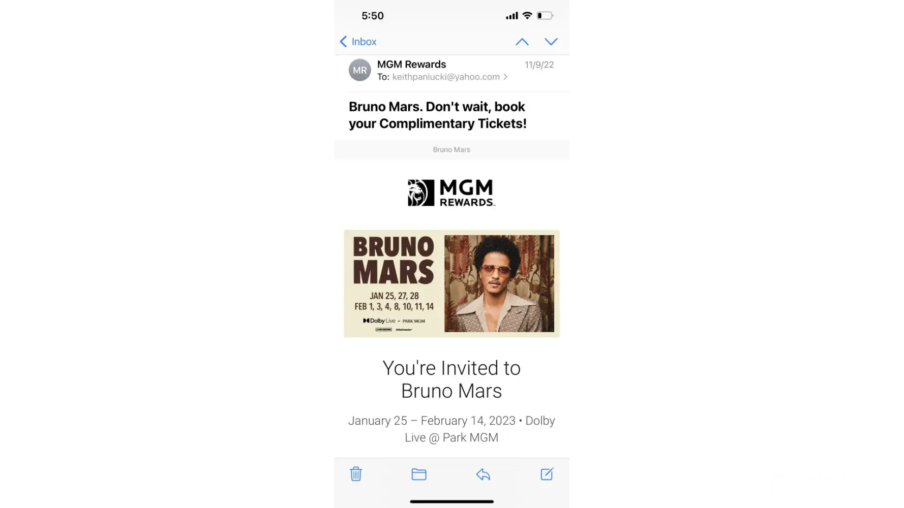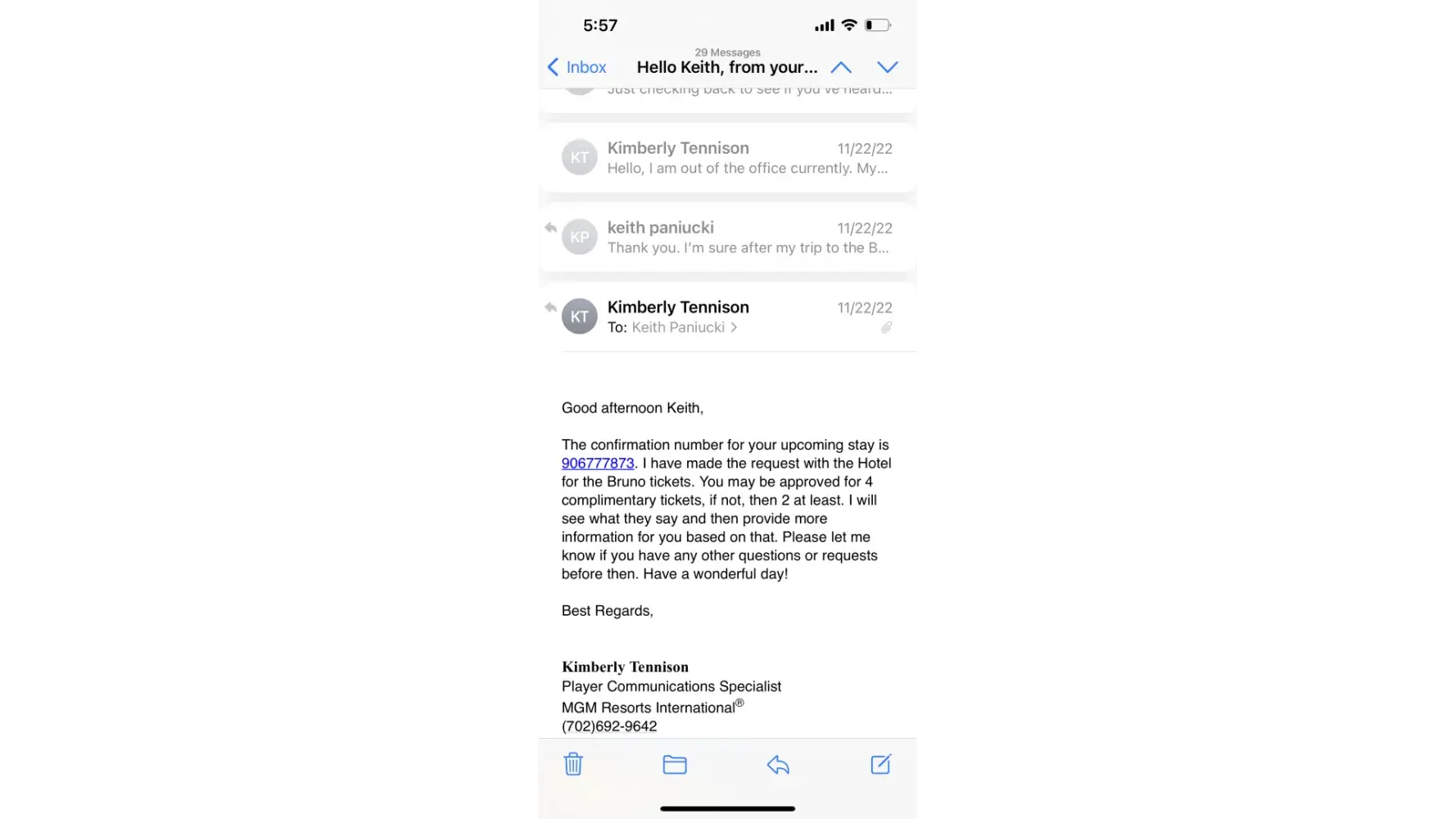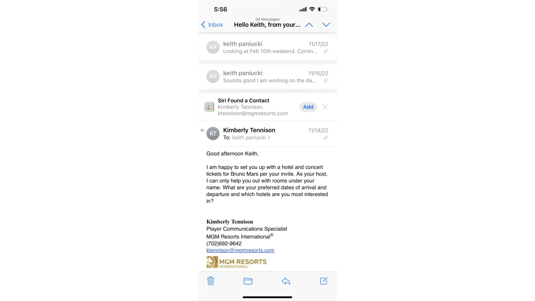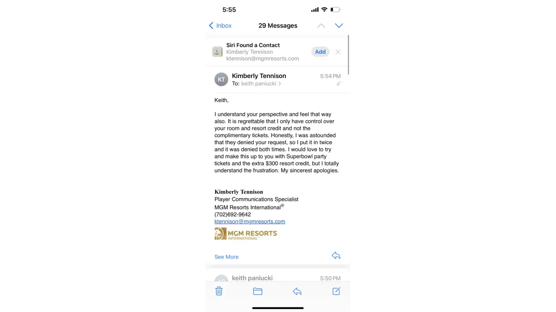Sent offer for Bruno Mars tickets on Nov 9th sent email to Kimberly Tennison of the 12th that I would like to take MGM up on the offer and book me a trip. On Nov 22 she sent me a email with my confirmation #. I asked her to check and see if she could get me 4 tickets and if she couldn't I'll buy the other 2 I just wanted 4 together because another couple was coming with us all traveling from Florida. She mentioned having to check with the hotel and would let me know. This past Friday I was informed not only was she able to get the extra 2 tickets, she couldn't even get me my tickets so I have NO tickets. I've booked my airlines and our stay at Aria and now we are looking at cancelling the trip and are more disappointed than you could ever imagine. I was a platinum rewards client before covid and recently started to book trips back to the Beau Rivage since its your closest property to Florida. My member # is [protected]. I'm just having a difficult time understanding what happened here as I know nothing was dropped on my end. I contacted 3 days after receiving the offer and have a confirmation # booked all the way back in November. I'm a person of principle and I can Guarantee you that this will certainly effect where I decide to gamble going forward. She offered a $300 resort credir which doesn't even buy 1 ticket on Ticketmaster so that was really a slap in the face. Attached is copies of the email string.
