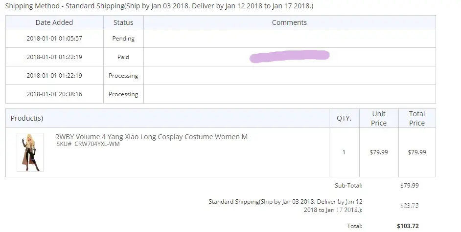 The shipping that I paid stated the costume would be here around 12-17th of Jan. It is the 19th and I have yet to see it has even been shipped off. This costume was highly expensive for me and when the company asks for extra money for shipping but doesn't commit to the dates they provide it really disappoints. (Photo attached to show progress demonstrated by company and proof of purchase)