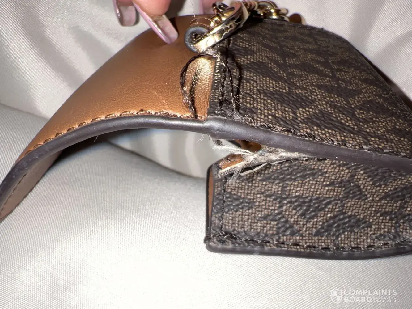 We have purchased Michael kors handbag but after a year it had shown a defect and the skin of the beg is automatically getting removed I need you to please help and fix this