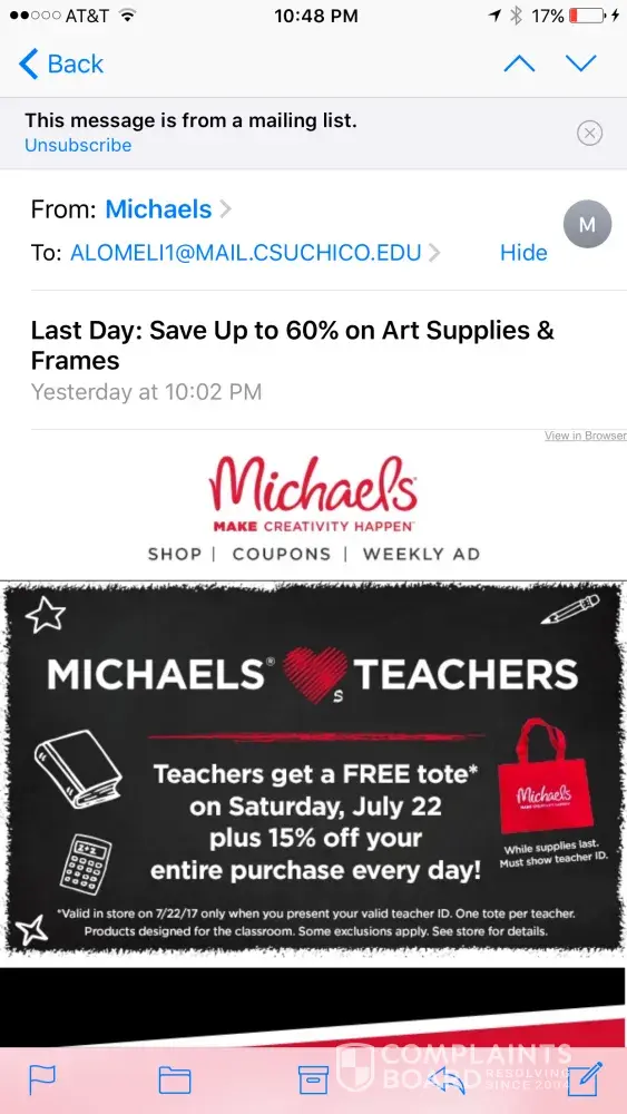 I went into Michael's to get my teacher tote, as I received three emails reminding me to. Unfortunately, the manager, Linda, didn't seem to care to help me. Since she hadn't heard about the teacher tote "since 1:00 this afternoon" (she kept repeating that), it meant that it didn't exist. I told her I had several emails reminding me about it, but since she knew nothing about the promotion, even after I showed her my email, apparently I was wrong. I saw the totes behind the registers, and pointed them out (the email also had a picture of the tote). But she didn't give me anything.