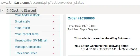 I have been a victim of online e-commerce website timtara.com. The company’s address is Infosecure Consulting Pvt. Ltd., B-26 Second Floor, Sector 8, Noida, Uttar Pradesh -201301. I ordered a Micromax Canvas-II Mobile phone on 23-01-2013 and delivery was scheduled within 3 weeks, now it’s 1 month and the Order No. #[protected] still shows the status as