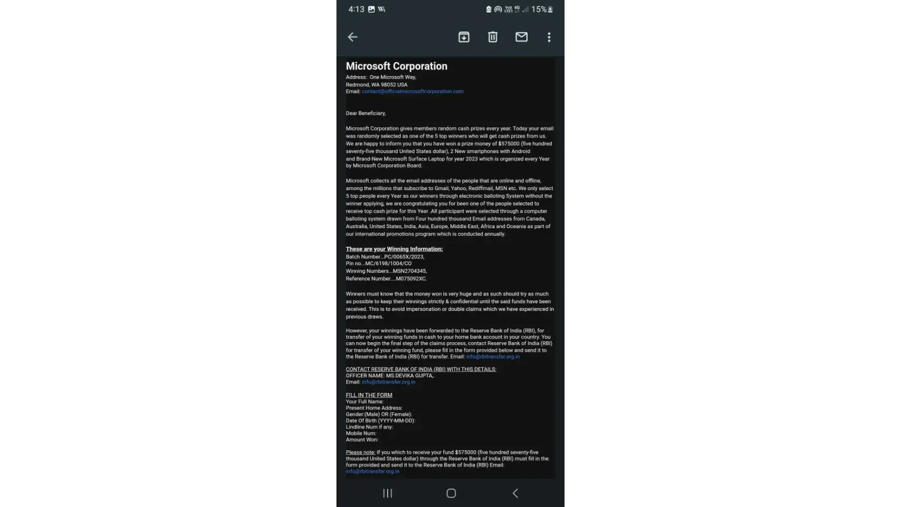 However, your winnings have been forwarded to the Reserve Bank of India (RBI), for transfer of your winning funds in cash to your home bank account in your country. You can now begin the final step of the claims process, contact Reserve Bank of India (RBI) for transfer of your winning fund, please fill in the form provided below and send it to the Reserve Bank of India (RBI) for transfer. Email: [protected]@rbitransfer.org.in