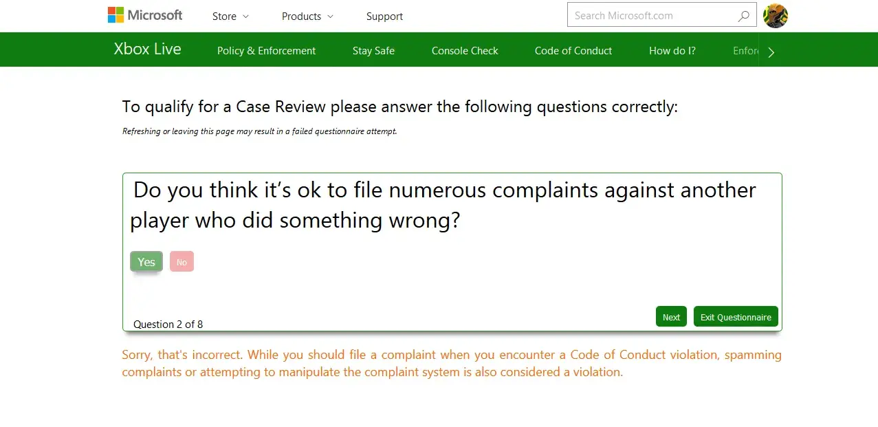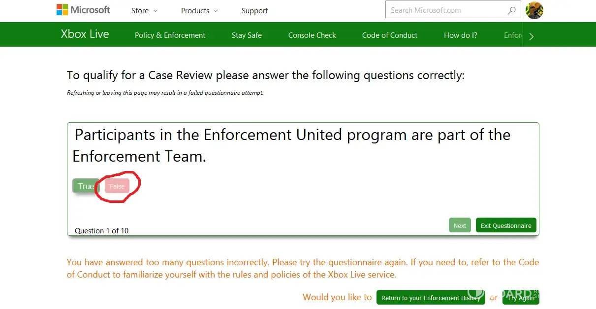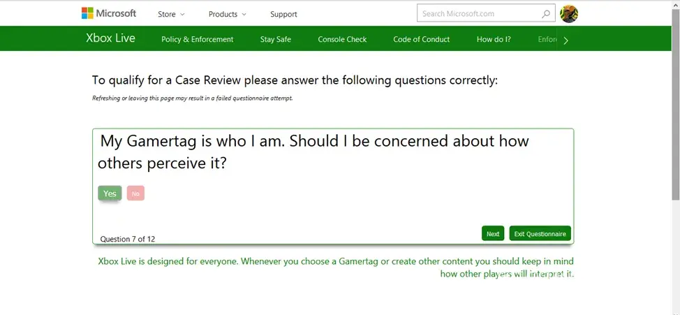 I tried calling customer service and they said they cannot help me! They said I have to get on the Xbox Enforcement Site and file for a case review. So I click to file and they MAKE ME answer 12 questions Correctly BEFORE I CAN EVEN REQUEST A REVIEW. 12 questions that are mostly vague and don't make sense! If you get more than a few questions wrong, they make you wait another 24 hrs. before you can answer the questions again. So I got them wrong and had to wait 24 hrs to get on the site again.