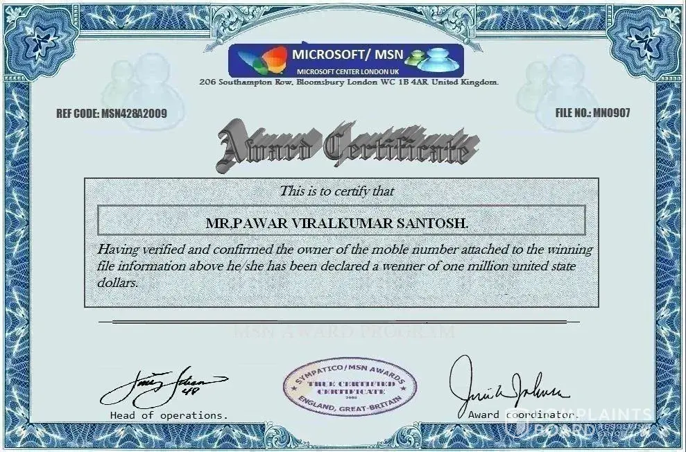 A Cheque will be issued in your name by Microsoft Corporation Board UK (MCSP), you have therefore won the entire sum of £1, 200, 000, 00(One Million Two Hundred thousand Great British Pounds Sterling) which consequently won in the 2nd category.