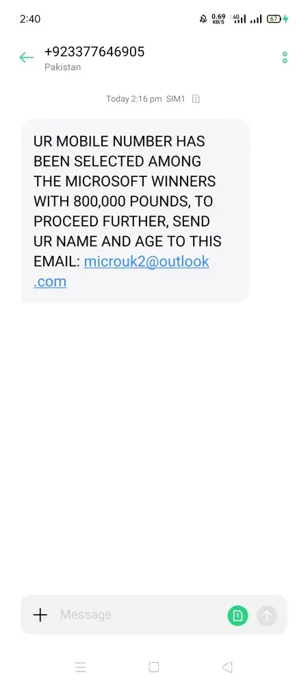 I zayad asif have received message today 10-07-2020 from this number +[protected] that you have been awarded a prize 800, 000 pounds in the 2020 uk microsoft mobile draw. to claim your prize send your name, age, mobile no send to msworld@live.com