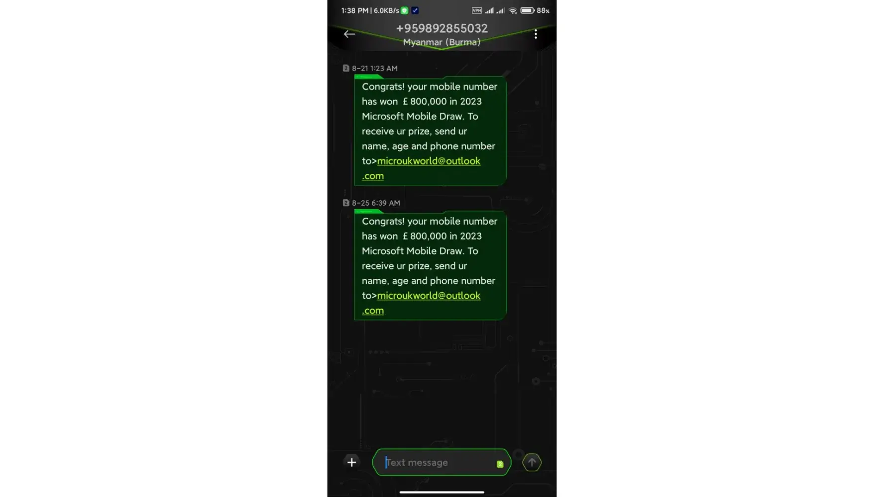 Congrats! your mobile number has won £800,000 in 2023 Microsoft Mobile Draw. To receive ur prize, send ur name, age and phone number to>mmcsfc@outlook.com
