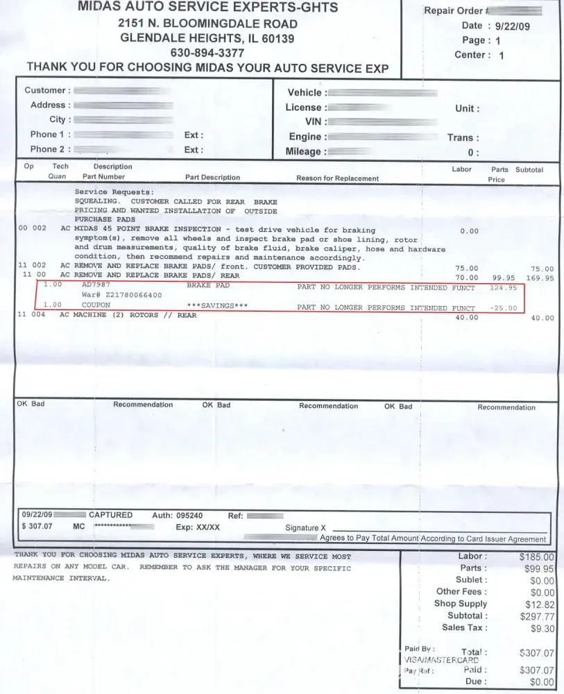 No matter what it says, Midas is smarter than you and they'll prove it on your final invoice. Say you need brake service, typically a $210 service to get new pads and the rotors turned (smoothed out). The $210 is an industry standard and - for example - my invoice said the brake pad service cost $124.95 (parts and rotor turning not included), but then they slip in their own sneaky little line that says "Savings-$25 Off". Guess what, the total STILL adds up to $210.