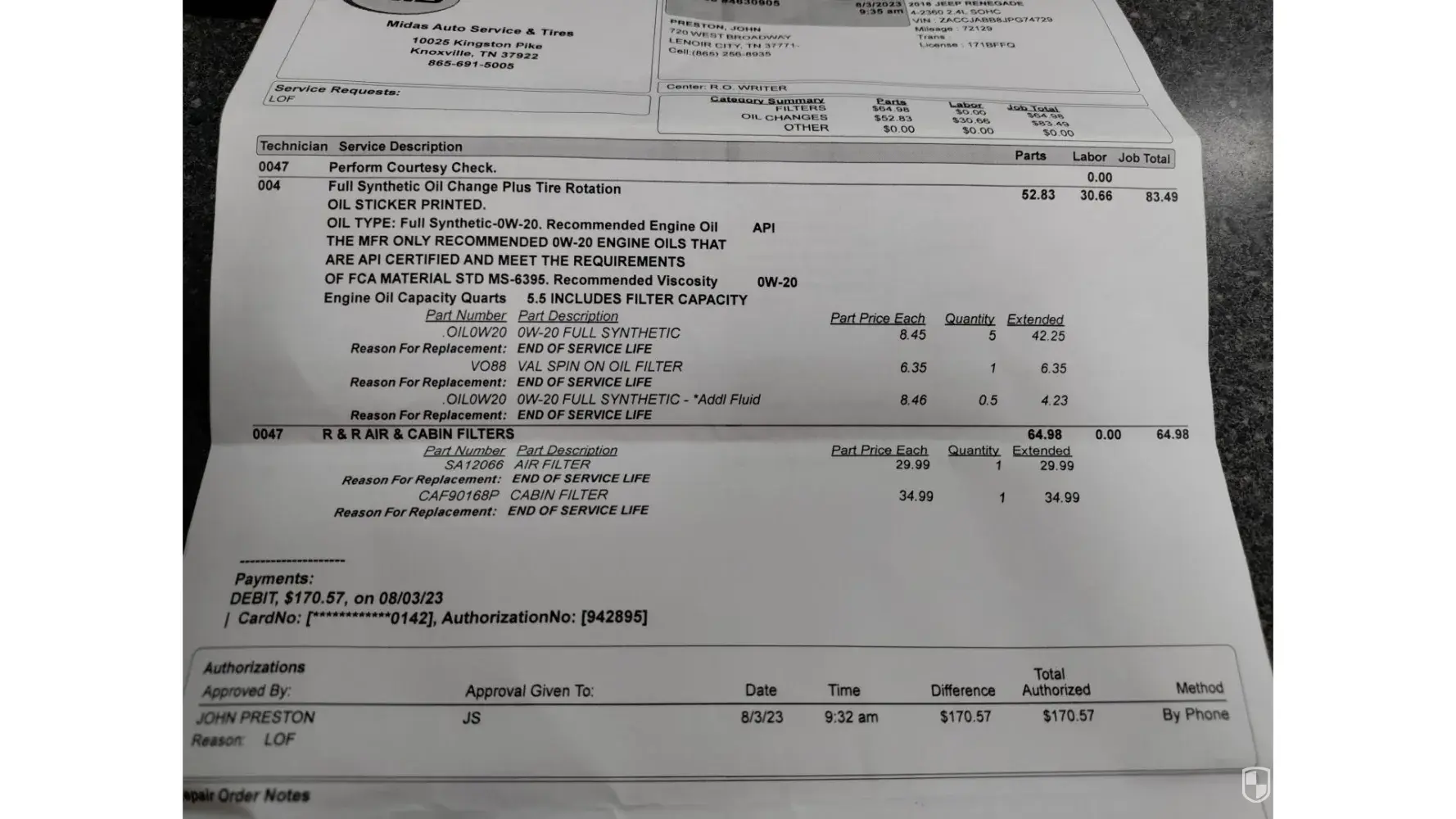 I went in for oil change in August 3, 2023 because they had a special. It was $59.99 full synthetic oil change. I also needed air filter $29.99 and cabin filter $34.99. The total with 9.25% tax should have came to $136.53. I was shocked when my total ended up being $170.57. That is nothing but false advertising.