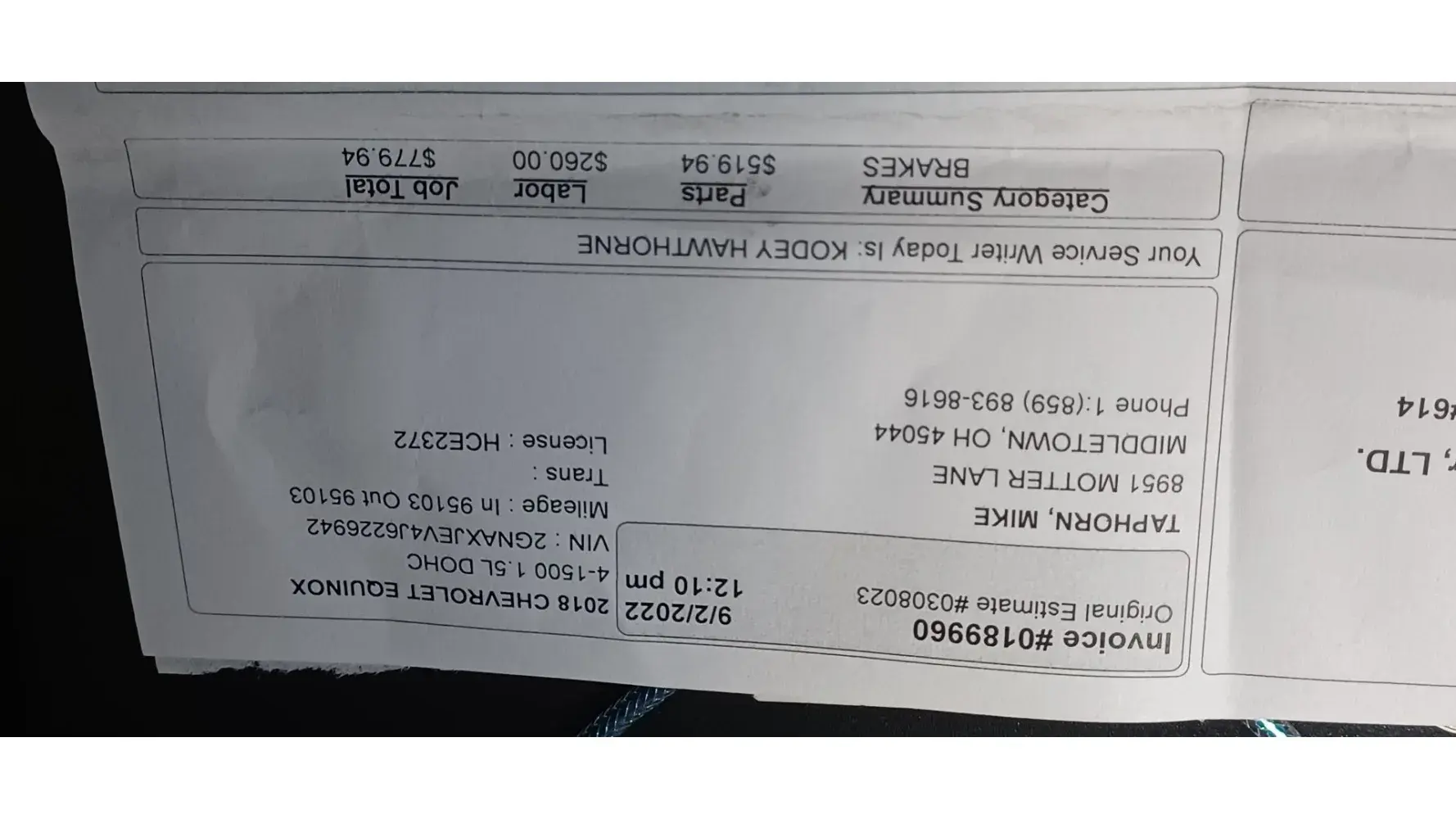 9-2-2022. Front and rear brakes replaced