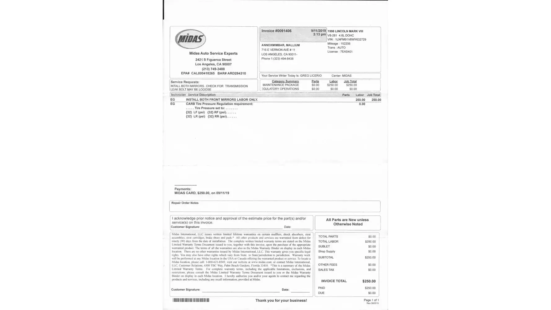 I reserved an appointment to have my 1998 Lincoln Continental Mark VIII serviced at a Midas servicing station located at 2424 Figueroa Street in Los Angeles, California. I dropped my car off on July 27, 2023, at 8:00am. When I left my Lincoln Mark VIII at the service station, the cashier told me it may take a little while but they'll get the service done. I...