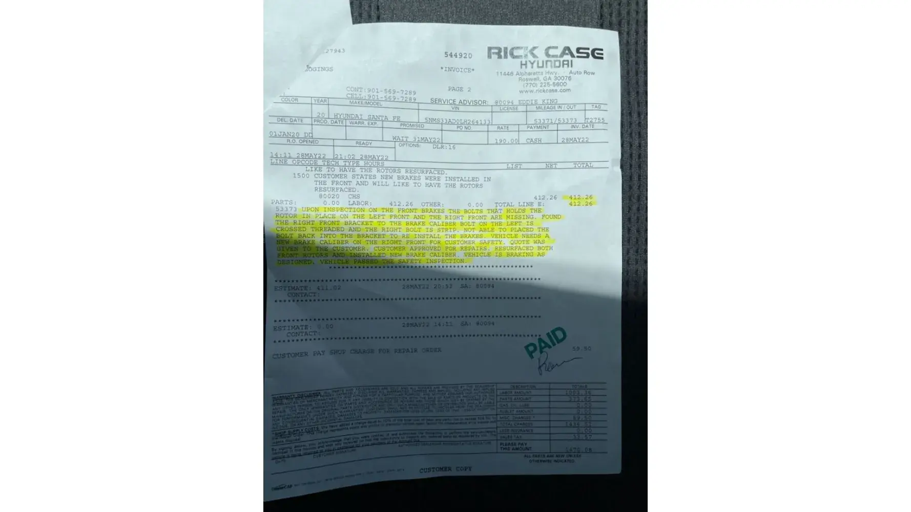 I went to the Midas at 6629 E. Northwest Highway; Dallas, Texas 76231, to have brake pads installed on my 2020 Hyundai Sante Fe with the vehicle identification number (VIN) 5NMS33AD0LH264133 (see attachment brake replacement receipt MIDAS). I paid a total amount of $142.26 for the service. During the brake pad installation, I informed the store manager, Sam Aminzadeh, that I was traveling to Nashville, Tennessee, and Roswell, Georgia, on May 28, 2022. I traveled during the night to ensure I was at Rick Case dealership in Roswell, Georgia, early on May 28, 2022, to ensure my vehicle received service from the dealership's mechanic.