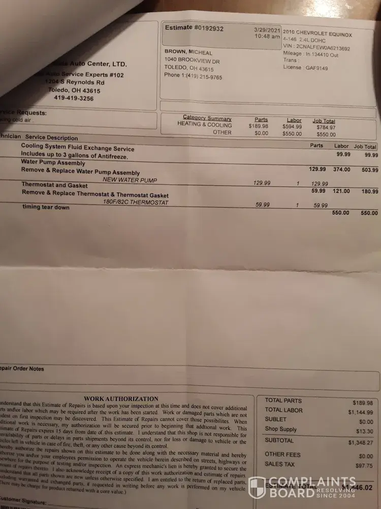 On November 13th I had Midas replace my thermostat gasket and they charged me $701 and $0.49. They would not bring me the housing part 2 show me that it needed replaced. I had somebody else look at it earlier and it did need replaced. But Midas told me that would eventually go bad. I later after the replacement had no heat again in the car. Only to go to...