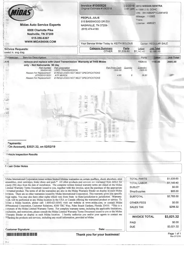 In 2020 I had problems with the transmission in my 2012 Nissan Sentra. I took it to Midas and they replaced the transmission. It failed again in late 2020, and I have since discovered that they had to have known the 2012 Nissan Sentras had a transmission problem all along but didn't tell me and charged me for the replacement. (I have my invoice.) My car is unusable.