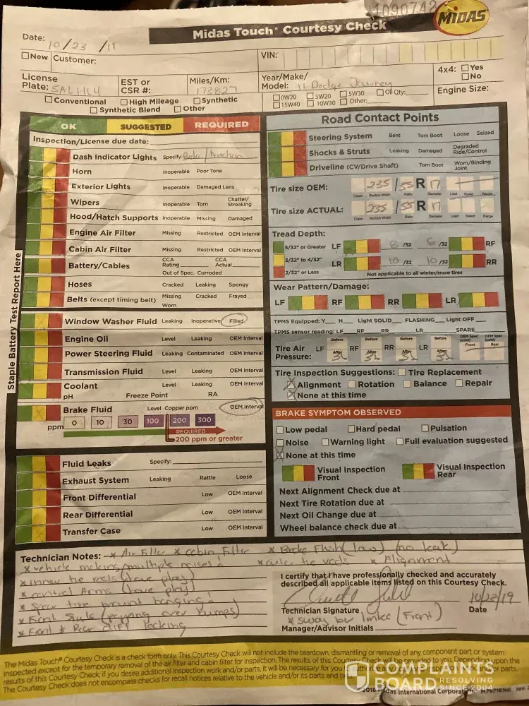 Be advised that have a complaint regarding my experience with Midas auto service (Please see attached receipt).