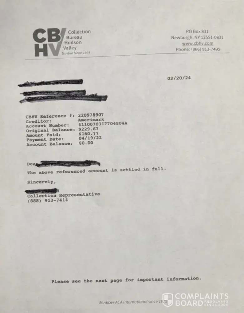 Midnight Velvet is constantly committing fraud. They are routinely reporting to all three credit reporting agencies that I owe them over $600 on my account. They NEVER CREDITED me for the payments I did make.I settled with AmeriMark which is Midnight Velvet's previous parent company on April 19, 2022, for $160.77 with Collection Bureau of Hudson Valley (CBHV). I am not sure why Midnight Velvet's accounting/billing did not make any adjustments but if this matter is not resolved immediately then I will have no choice but to file an Attorney General of Wisconsin fraud complaint because that is what this is since the settlement dated April 19, 2022.