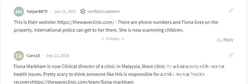 Fiona Markham is now Clinical director of a clinic in Malaysia, Wave clinic for adolescents with mental health issues. Pretty scary to think someone like this is responsible for a child mental health recoveryhttps://thewaveclinic.com/team/fiona-markham