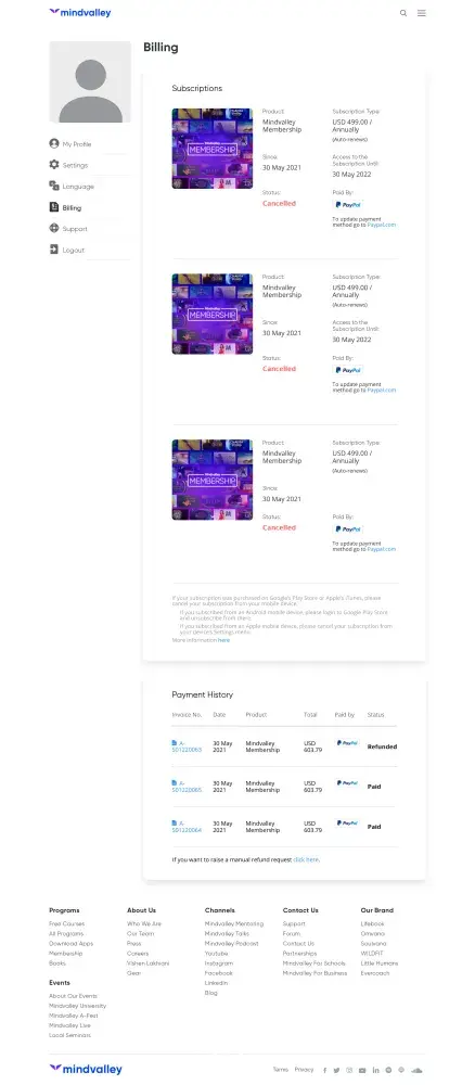 Mindvalley has an advertising process combined with the subscription process which is unclear and ultimately works against the client. E.g. After watching an advertisement of a course on youtube " Wildfit", I liked the course and I decided to buy the course as it was one of the courses offered outside of the Mindvalley membership. Soon, I have discovered that I was billed for the additional membership- a surprise discount of 400 CAD. I clarified the situation and my membership was canceled, I received a refund at that time. Later, I was encouraged to use Mindvalley app on my Apple phone to get informed about other courses and to participate in a trial. One of the trial courses was " Tantra". I tried it, I didn't like it, I didn't move further than a second session... and... as I discovered (much later ) that I was billed for the course, 299 CAD. I do not recall if this course was also tied to the membership subscription. Yet, I am sure that the "Tantra " course appeared on my app ( it was not my choice or the result of my browsing). As around that time MR. Vishen was actively advertising his daily coaching. I blocked my apple Payments via PayPal. Yet, weeks later on some occasion, I removed the blockage. I was unaware that at that time Mindvalley charged my subscription of more than 700 CAD. As at that time I was in the middle of a serious family situation and preparing for a long journey, I didn't notice that my visa was charged. I noticed it much later. As I didn't use Mindvalley services since that time, I tried to contact the company in order to clarify and to resolve this issue. I reached out to pay pal, which refunded me 5$ for an ebook ordered in Mindvalley, yet never delivered, they clarified why one of the coaching courses ( offered also outside of the membership) did not appear on my Mindvalley site. I understood that I can buy some courses offered outside of the membership without having a membership. I was seeking clarification to all of it directly with Mindvalley ( support team, chat, email to contact Mr. Vishen)- all with no result. Mindvalley collected around 1000 CAD truth untransparent procedures and they there is no way to address it with them. Paradoxically they claim to be teaching about personal development.