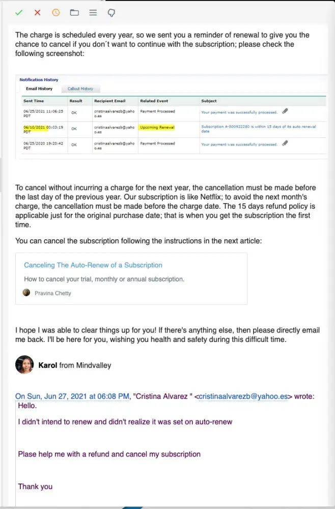 Last January, I bought a year's subscription to Mindvalley. I was very surprised to see that, on January 6th of this year, I was charged $499 for an additional year's membership. When I went onto the website to investigate, I realized that the auto-renew function was enabled. Their website claims that you will be notified 15 days in advance of the automatic charge. I immediately went to my email to see if I missed a notification that I was going to be charged in advance. However, there was no such email. I checked my deleted items and spam - again, no email. When I spoke to a customer service representative (it was hard to speak to a human being), they responded that they "would look into it" but maintained that the charge would remain. I replied that this was fraudulent and in bad faith. How can I be expected to uphold my end of the deal (payment) if they do not uphold theirs? Eventually, I was directed to fill out a form to obtain a refund. However, three weeks on, I have not heard from anyone and the $499 charge remains on my credit card. According to the auto-renew laws in CT, "Seller must provide the recipient of products or services with a clear and conspicuous written notice that the recipient may cancel such contract.
