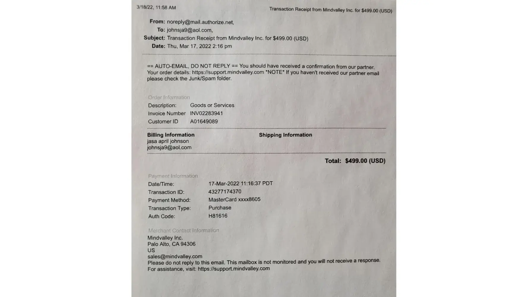 Received a notice from Auto-Receipt/Authorize Net for $499.00 for automatic payment to MindValley. I've checked all my emails including trash and span, and there was no notification from Mindvalley. This was for a second-year renewal of their program/product membership.