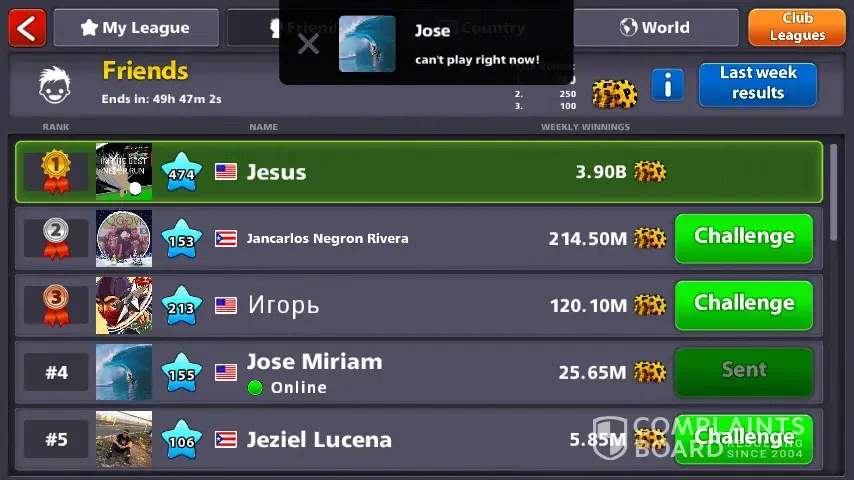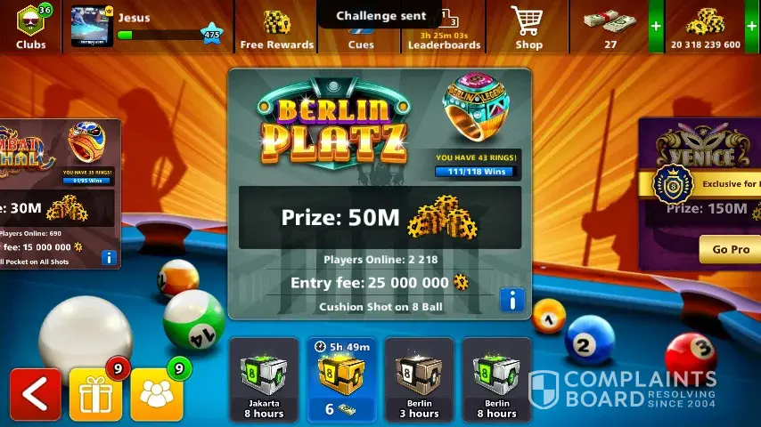 complain every week I given complain the some body doing something to my account and I give you a complaint every week and you know do s*** about it now I have 20 billion and you pick my 20 billion out I am going to get a lawyer and I'm going to f****** suit 8 poll I won my 20 billion back I spend money in the freaking game and I didn't tired they don't have any respect for me I don't know how the hell I going to hack 8 pollwith a freaking phone I spent a lot of money in the past six years you give me all my money back I stop playing the game but if you not going to give me my money back I won my 20 billion because I have a picture in a the proof that I have 20 billion