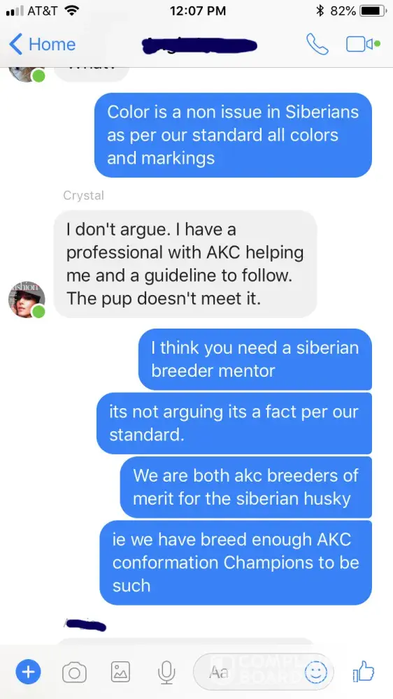 I have purchased 2 puppies from Ms. Chism and have additionally bred to one of her stud dogs. I have found Ms. Chism to consistently be professional and courteous, advising me on contracts, sales, and breeding. I know Ms. Chism to be well-respected within the Siberian Husky community and a member in good standing with the Siberian Husky Club of America for whom she edits publications. Ms. Chism is very active in the Siberian Husky community in Texas, and is known to be kind and willing to mentor not only exhibitors new to the Siberian ring, but other breeds as well. I saw the aforementioned post on Facebook, however the OP's story is not quite accurate as she did not see the post herself. The OP's name was not mentioned at any point, nor was anything said about the OP other than, "Seller beware, " which is something that most breeders do in order to protect other breeders from stumbling into a contract that they may eventually regret. The entire situation was simply an "FYI" from one breeder to other breeders, and comments made below the original post are not in the control of Ms. Chism, nor did they necessarily reflect her own views. I understand that the OP's feelings were hurt, but I believe that to take things to the internet in an attempt to hurt Ms. Chism's business is reprehensible. What the OP does not reveal is that she also took this to the BBB in another attempt to destroy Ms. Chism's business, and was told that this small, personal situation does not warrant investigation by the BBB.