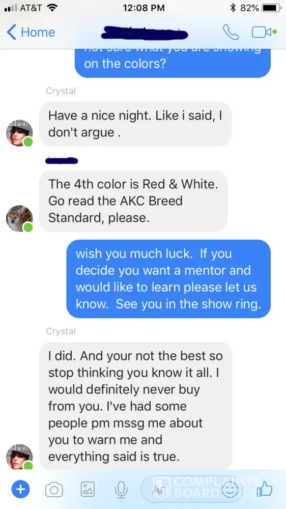 At this point you then began to get very rude and hostile. The puppy was never offered to you, it was shown to you as a possibility. You would have had to go through extensive screening, home check, and sign a lengthy contract in order to purchase the puppy IF you were approved. Again not my puppy; however there was noone upset at you not purchasing a puppy that wasn't even available at the time, nor were you approved to purchase it. We offered to help you in any way we could to educate you on the breed, and showing in AKC. I will admit that I may have been a little curt and blunt at some points in our conversation after you started attacking my character.
