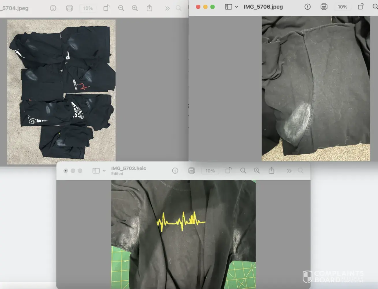 Claimed loss: $150 in work tshirts / shirts that have to be replaced every 6-10 weeks.I had issues uploading the photos but I can send more if required.