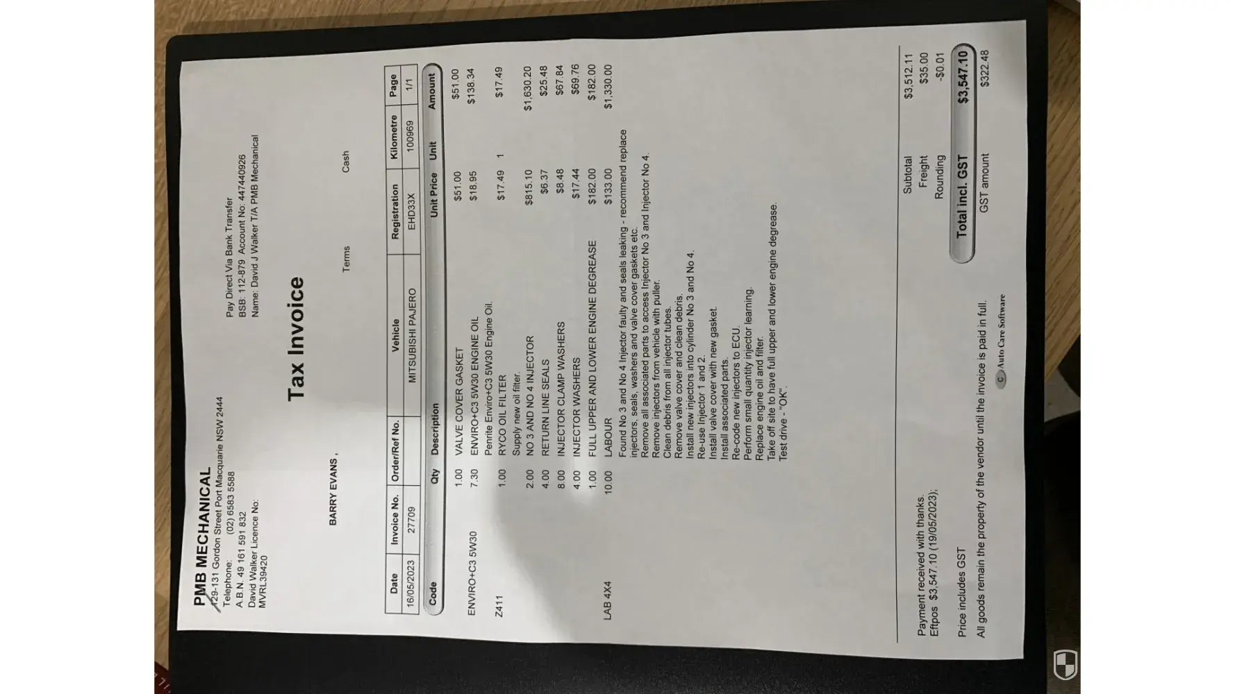 I purchased this vehicle form Cricks Mitsubishi Tweed Heads, it is a 2018 model and it has just completed 100,000kms. Last week, on a trip to Sydney the car broke down and had to be towed into Port Macquarie following an NRMA inspection. The car was left with PMB Mechanical (invoice available) who initially identified that at least one of the fuel injectors was leaking. Upon a fuller inspection it was determined that No 3 and No 4 injectors were faulty and leaking. These two injectors had to be replaced and the other two had to be reconditioned. The total cost of these repairs was $3,547.10