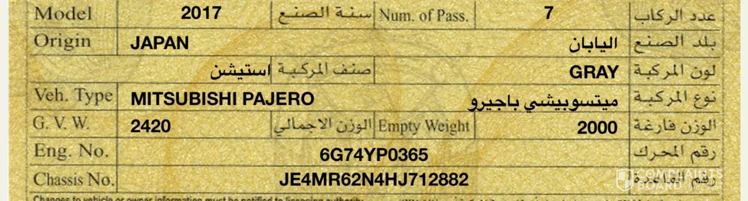 It is a complaint that I am a resident of ksa and I purchase a mitsubisi pajero model 2016 and millage are only today 42000+