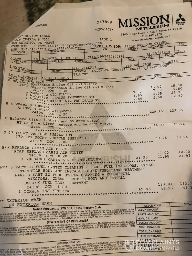 Hi my name is Tracey. On 09/16/ 19, I called Mitsubishi and told them I needed my oil changed and an alignment . I arrived to Mitsubishi . Service manager Jerry coward then came to my car window and said "tracey!" I said "yeh " . I then told him I wanted to get an alignment done and an oil change . He then said"I also recommend you get your tires rotated "...
