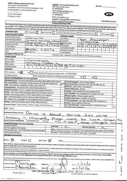In july I went to mtn to report my samsung note 4. It just went off even though it still had enough battery life. It also was stuck now on the locked screen. I couldn't get access to my phone. They sent it away to be repaired.
