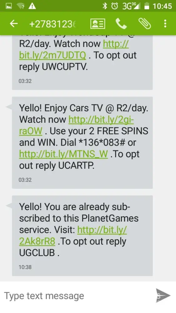 MTN is subscribing customer unaware as I have received SMS's at night Saturday 03.03.2018 around 23:17 pm. I was sleeping at that time, the sms was saying (you have been registered with MTN Gamer+) that will cost me R3/day.