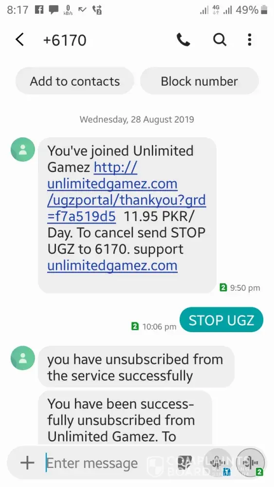 You've joined Unlimited Gamez http://unlimitedgamez.com/ugzportal/thankyou?grd=f7a519d5 11.95 PKR/Day. To cancel send STOP UGZ to 6170. support unlimitedgamez.com