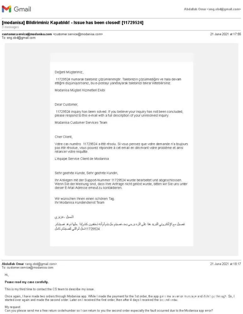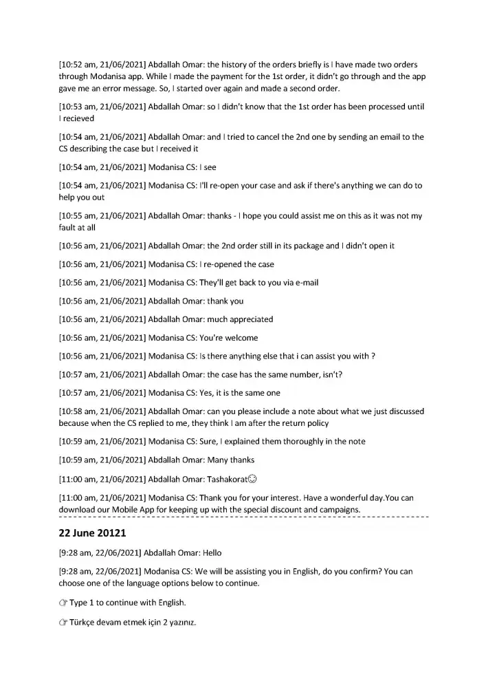 On the 1st June, I made an order through the Modanisa app. while I made the payment for the order, the app gave me an error message and didn't go through. So, I started over again, spent 4 days collecting my items again then I made the second order. After a while I received the first order which I wasn't aware of because the app didn't confirm the payment. So, I emailed Modanisa CS to cancel the 2nd order but they didn't respond.