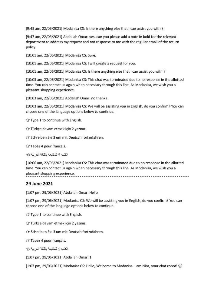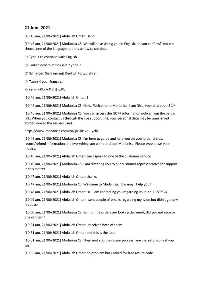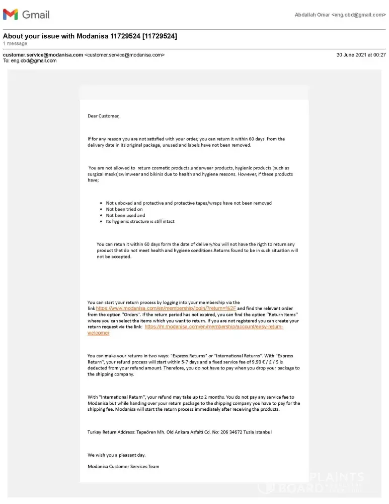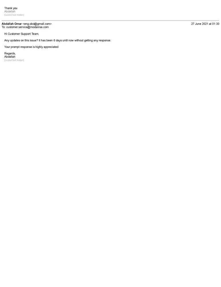 I hope that the Modanisa team would respect their customer and our time, and to consider my complaint and solve it.