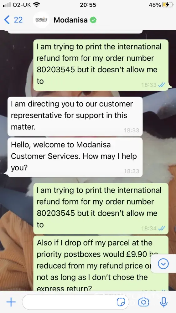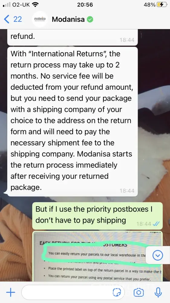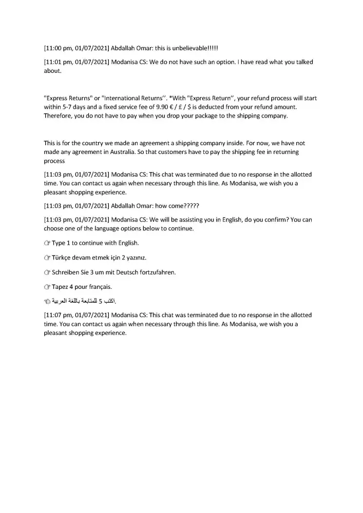 At the end I received an email from the CS team that mentioned that I could return my packages through express return with a fixed service fee of $9.90 which will be deducted from my refund amount and I don't have to pay to the shipping company when I drop your package. Therefore, I have done all the packaging and tried to find how I can do the express return on Modanisa website but I didn't find it. I contacted the CS team again through whatsapp and the CS rep. said that I am not eligible for the express return! which means that I have done all of the packaging for nothing. I was very disappointed because I wasted my time as a result of Modanisa again (this time because the CS team provided me incorrect information) Moreover when I tried to explain my dissatisfaction to the CS rep, he/she terminated the conversation after 2 minutes while I was writing! I even requested the CS rep. to escalate my issue and he/she ignored my request (please see my whatsapp chat for reference)