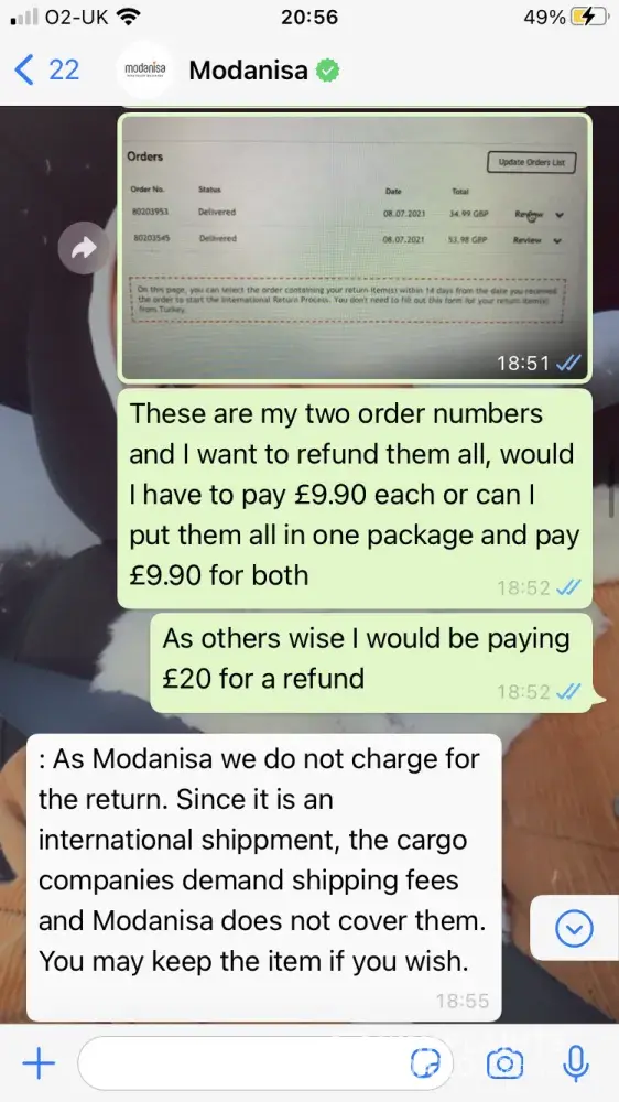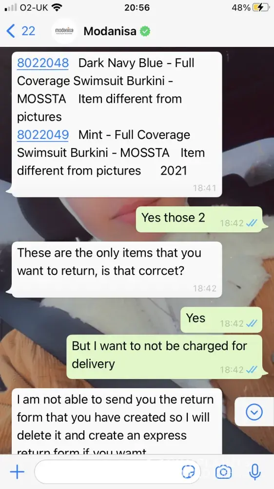 I ordered 3 burkini's, all of which had a satin material and are quite thin unlike in the images where it looks thick and elastic (as a swimsuit should be), When I came to refund the items I was informed that I had to pay £9.90 on each of my packages (two packages) although when I came to look at the product itself the refund policy wasn't there, anyways when I contacted customer service via WhatsApp, I asked if I could refund for free as the items are faulty and not as described, but was informed that this wasn't an option, then I asked if I could at least put the items together so I wouldn't have to pay delivery for each package and they still said no. If the quality of the burkini wasn't poor I wouldn't have requested the refund in the first place, so why am I paying the price for modanisa's mistake. Also on their website it says that they have a warehouse in the UK which when I asked customer service where this was I was told that there isn't one, so if there isn't one why would you put misleading information on the website. I would like to refund all three items with no delivery fee.
