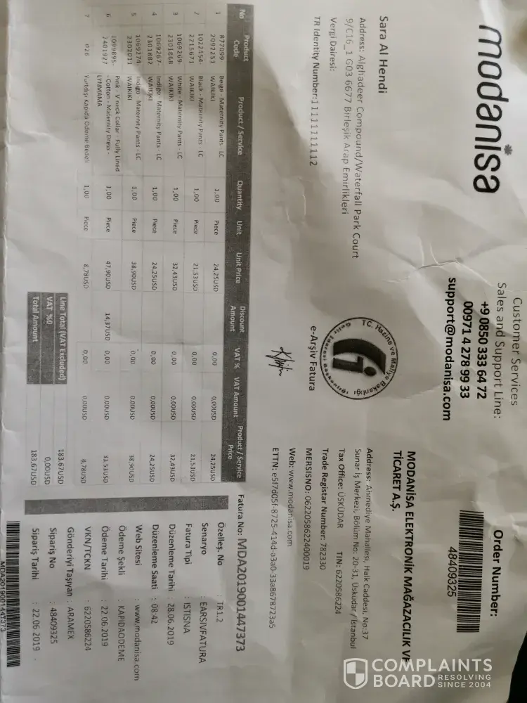 Extremely bad customer service and poor attention to customer complains. Application of online shopping is misleading the customer and it didn't give mention of customs fees despite modanisa team is fully aware about it. I made my order and paid by credit card on 11 jan2019 but mu purchases didn't reach up to date due to being stuck at customs. Modanisa customer service were very rude and not helpful. Info of customs was not mentioned at time of cheking out the basket. I refused the shipment since more than two weeks and my money didn't credit back. I called call center and raise complains over emails several times but unfortunately without any response or fruitful action