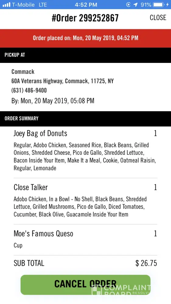 I would suggest that you list the local Moe's phone number rather than the full address when people charge items. This would make problems easier to resolve for customers. My problem won't be resolved until I get a credit or check for $11.23, but Moe's could make this process easier. Thanks!