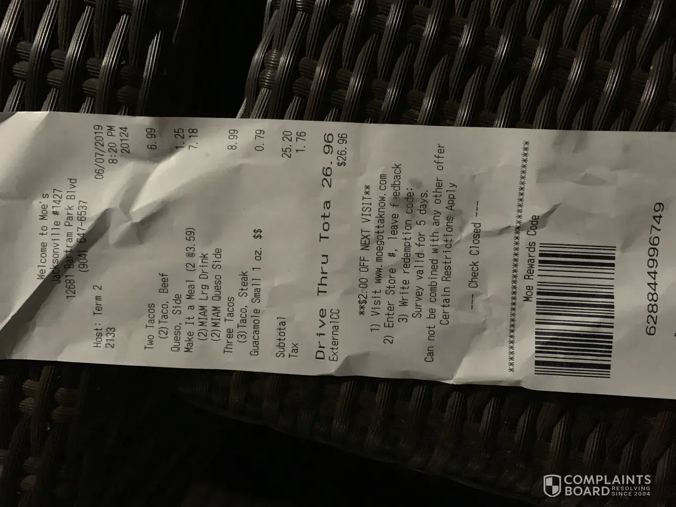 This is the second time I have been to this Moe's and they got our order wrong and I am very disappointed. We went tonight to the Moe's on Bartram Park Blvd in Jacksonville, FL at 8:20 pm. We ordered two meals, both tacos. One set of tacos was correct. The other set of three tacos was supposed to have steak, cheese, and sour cream. It came with guacamole on...