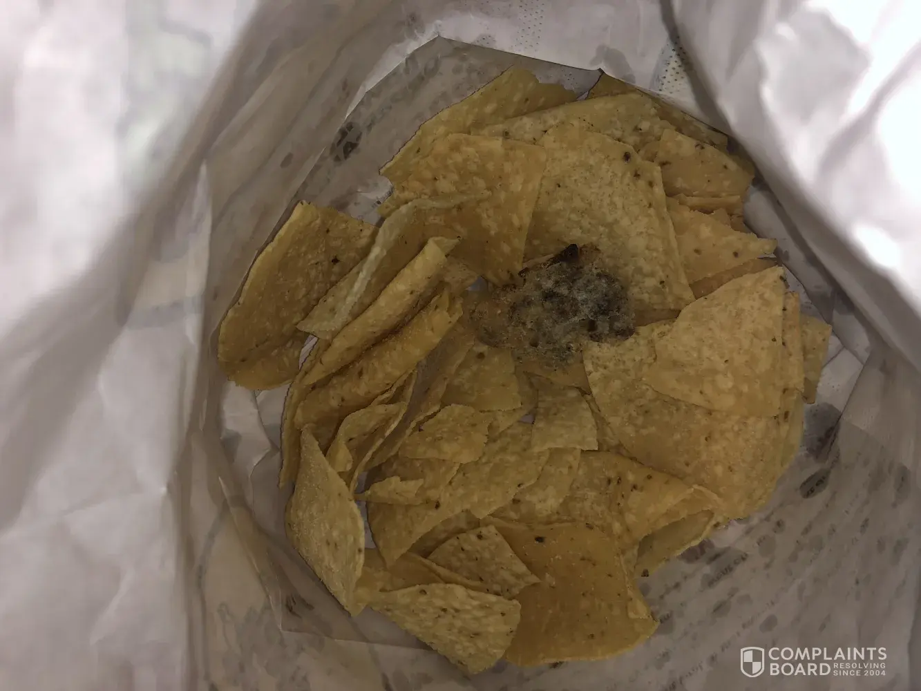 i got a cup of queso, which to start off was already only halfway full, then i was finishing off the chips only to finally look in at my selection and see this disgusting moldy looking chip. lost my whole appetite and i am completely disappointed because i was already disappointed with my purchase and to top it off almost ate this chip. overall this was just disgusting