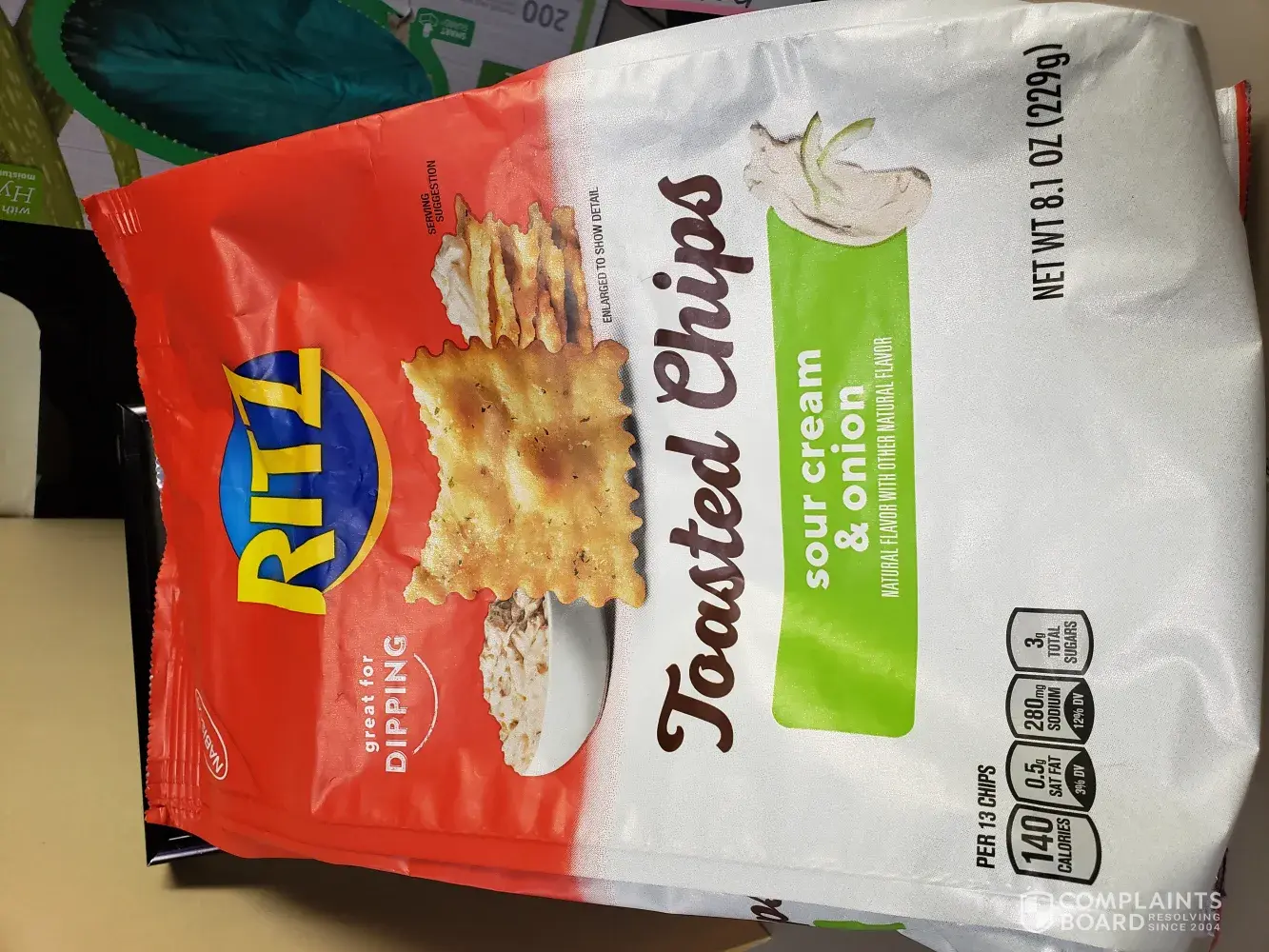 Chips had no sour cream & onion flavor on them, ask other people to try them and they also said they there was no flavor- Seemed like plain chips. - No Flavor. Chips had no Flavor- I am very disappointed in this product, I usually have good luck with Ritz products, but not with this product.