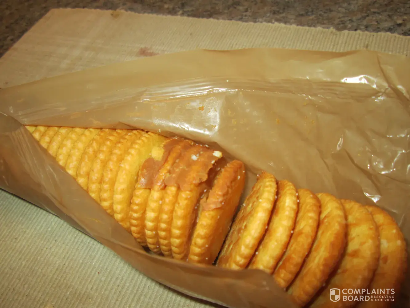 What the hell is in my crackers? In my entire life I never had an issue with ritz crackers but since you mexicans took over you apparently have 0 quality control. We are done buying any Nabisco/Mondalez products. Don't suggest to me that the box or the wrapping was damaged by some outside source either. This is crap and inedible. You can refund me for the entire box of 4 sleeves of crackers