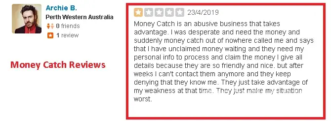 Money Catch is a abusive business that takes advantage. I was desperate and need money and suddenly money catch out of nowhere called me and says that i have a unclaimed money waiting and they need my personal info to process and claim the money I give all details because they are so friendly and nice. but after weeks I can't contact them aymore and they keep denying that they know me. They just take advantage of my weakness that time. They just make my situation worst.