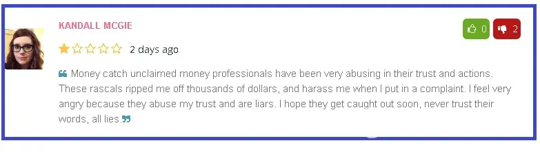 Money Catch is a scam service, the owner is Deanna Mannix, a sociopath that uses underhanded tactics to damage competitors that she feels threatened by. She is what you'd call 'gutter trash' and even that description is too kind. She is a self-promoter, and it's all lies, she is big noting her scammy service, and refers to herself as 'the leading unclaimed money professional' ( ask yourself who makes this up about themselves:).
