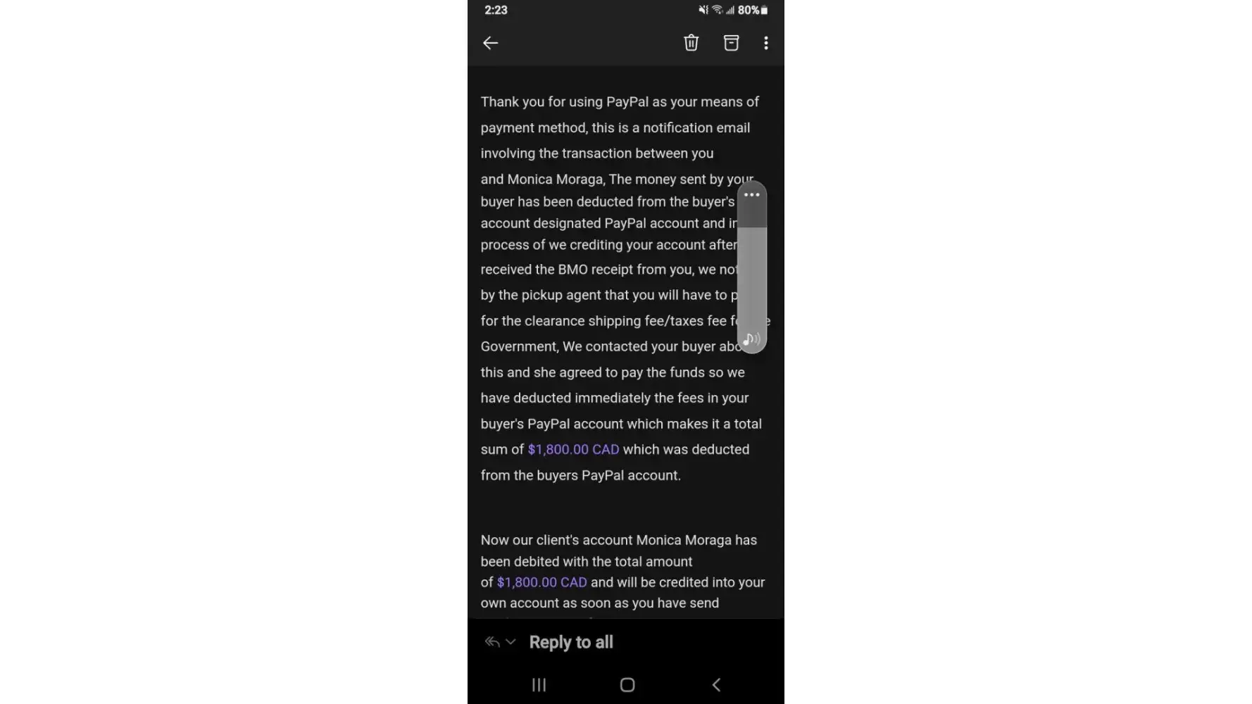 Thank you for using PayPal as your means of payment method, this is a notification email involving the transaction between you and Monica Moraga, The money sent by your buyer has been deducted from the buyer's account designated PayPal account and in the process of we crediting your account after we received the BMO receipt from you, we noticed by the pickup agent that you will have to pay for the clearance shipping fee/taxes fee for the Government, We contacted your buyer about this and she agreed to pay the funds so we have deducted immediately the fees in your buyer's PayPal account which makes it a total sum of $2, 300.00 CAD which was deducted from the buyers PayPal account.