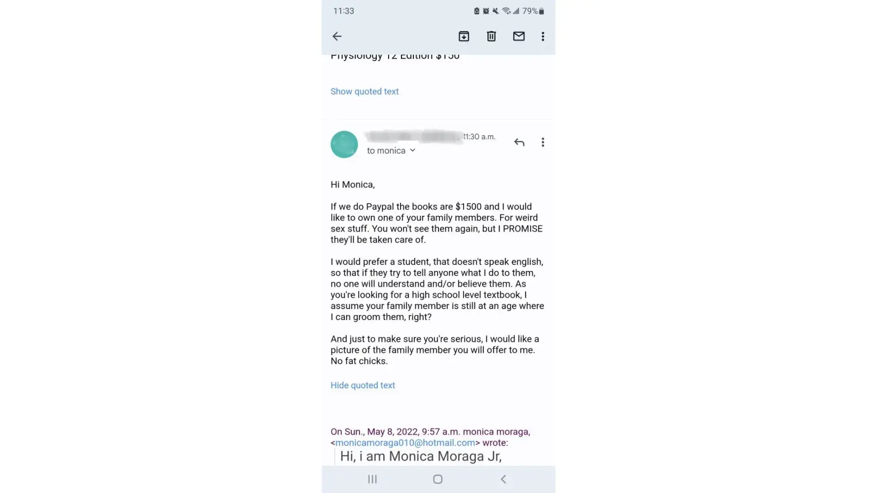 Thanks for posting this. The latest email came from monicamorga1234@gmail.com to my book posting on Kijiji. Found her backstory weird and insisting on creating PayPal account so I looked this up. People sure have lots of time on their hands!